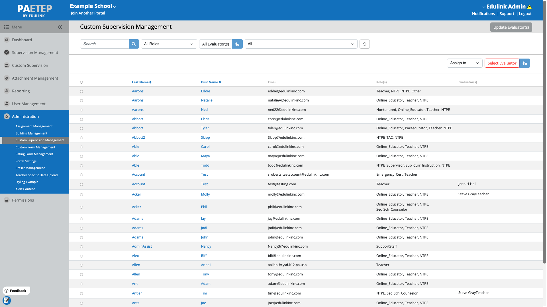 Custom Supervision allows districts to assign evaluators to employees in PAETEP for specific evaluation workflows. In particular, users with similar roles (or "peers") can be assigned to each other, without giving those evaluators access to the employee’s full evaluation history.