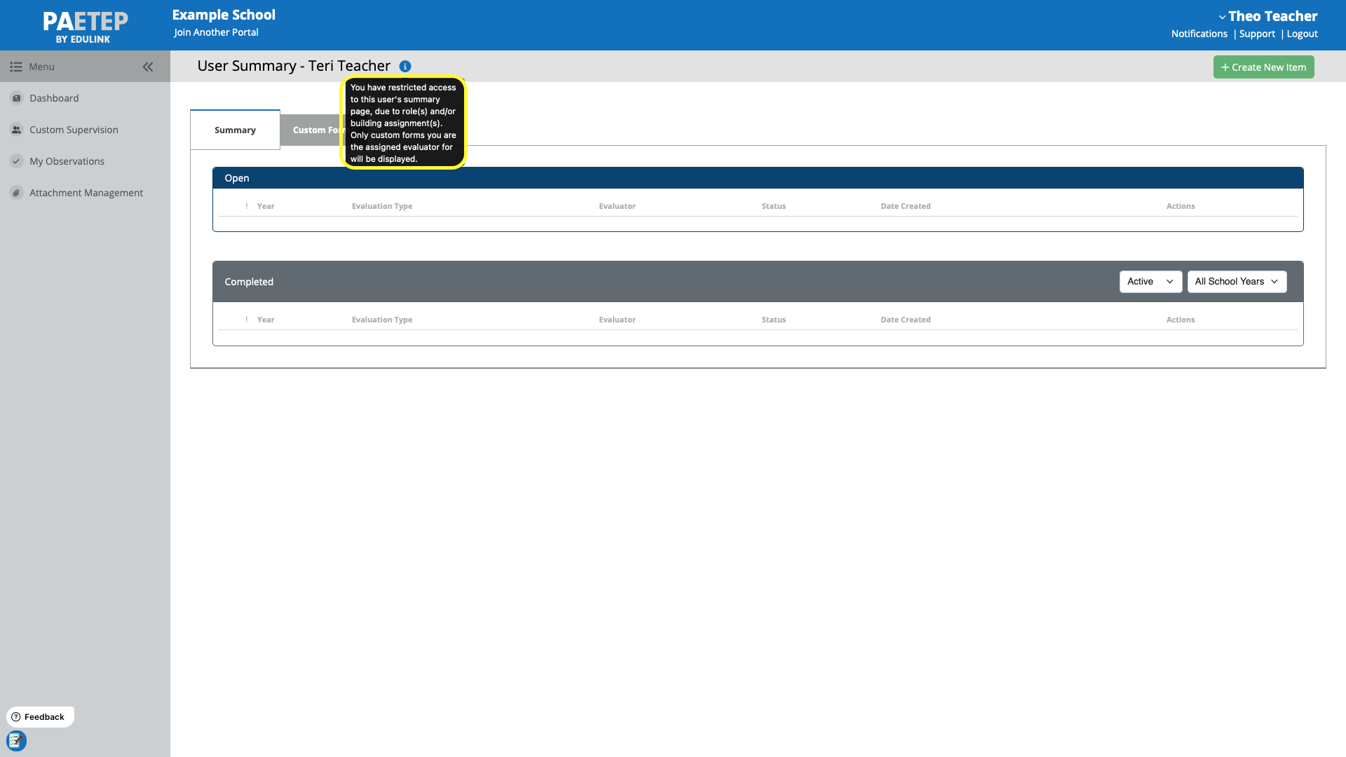 Custom Supervision allows peer evaluators to complete Custom Forms while maintaining limited visibility. This will allow teachers to work together, using PAETEP, to improve their instructional practice.
